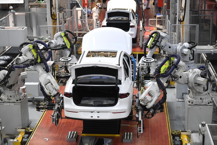 在广州市番禺区的广汽埃安新能源汽车股份有限公司总装生产线,机器人手臂在安装汽车轮胎(2023年2月24日摄)。新华社记者 邓华 摄