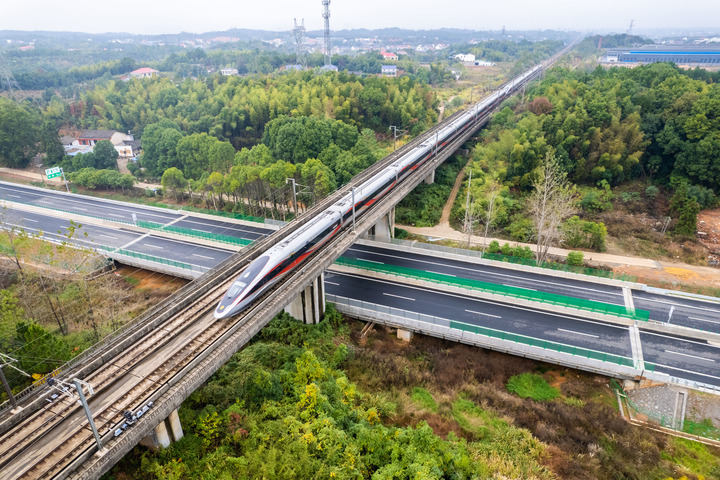 高铁列车从湖南省首条智慧高速——湖南平江(湘赣界)至益阳高速公路上方驶过(2022年11月28日摄,无人机照片)。新华社记者 陈思汗 摄