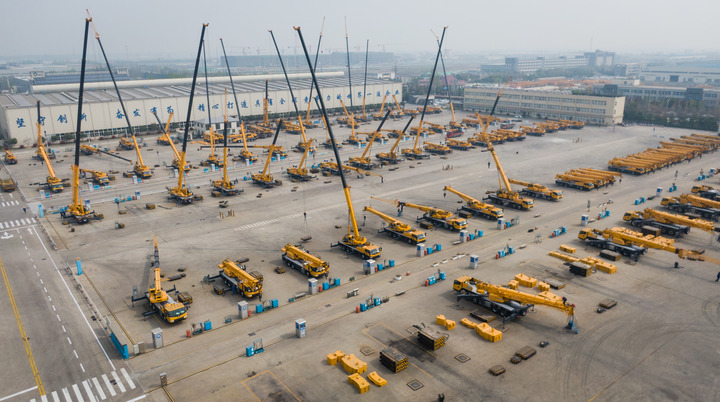 这是2019年4月4日在徐工集团徐州重型机械有限公司拍摄的调试中的起重机(无人机拍摄)。新华社记者 李响 摄