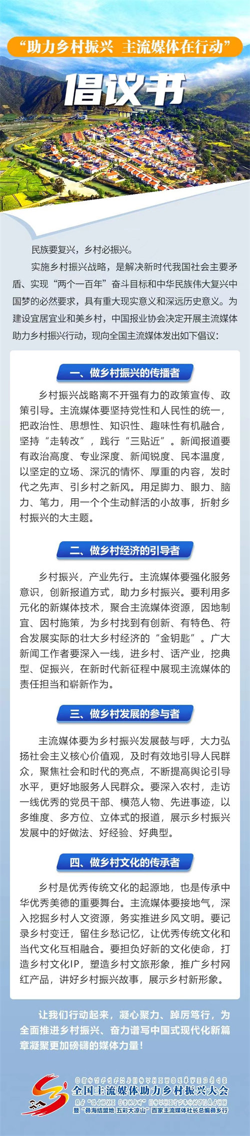 中国报业协会向活动表示祝贺,并发出“助力乡村振兴主流媒体在行动”倡议,希望主流媒体行动起来,凝心聚力、踔厉笃行,为全面推进乡村振兴、奋力谱写中国式现代化新篇章凝聚更加磅礴的媒体力量。四川省报业协会、凉山州委向全国主流媒体对凉山的关心支持表示感谢,希望各主流媒体用笔尖、声音和镜头,展示凉山连绵起伏的山河之美,见证凉山乡村日新月异的发展之变,总结出主流媒体助力乡村振兴的“凉山样板”,让满带正能量、主旋律的“凉山风”出大山、向远方。