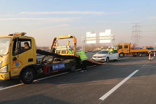 演练全程流程规范、衔接紧密,从监测调度中心接警派单、路产队员携装火速出动,到现场安全区精准布设、挪车器抢通超车道,再到无人机空中喊话疏导、联合交警实施车流分流,各环节环环相扣、高效联动。