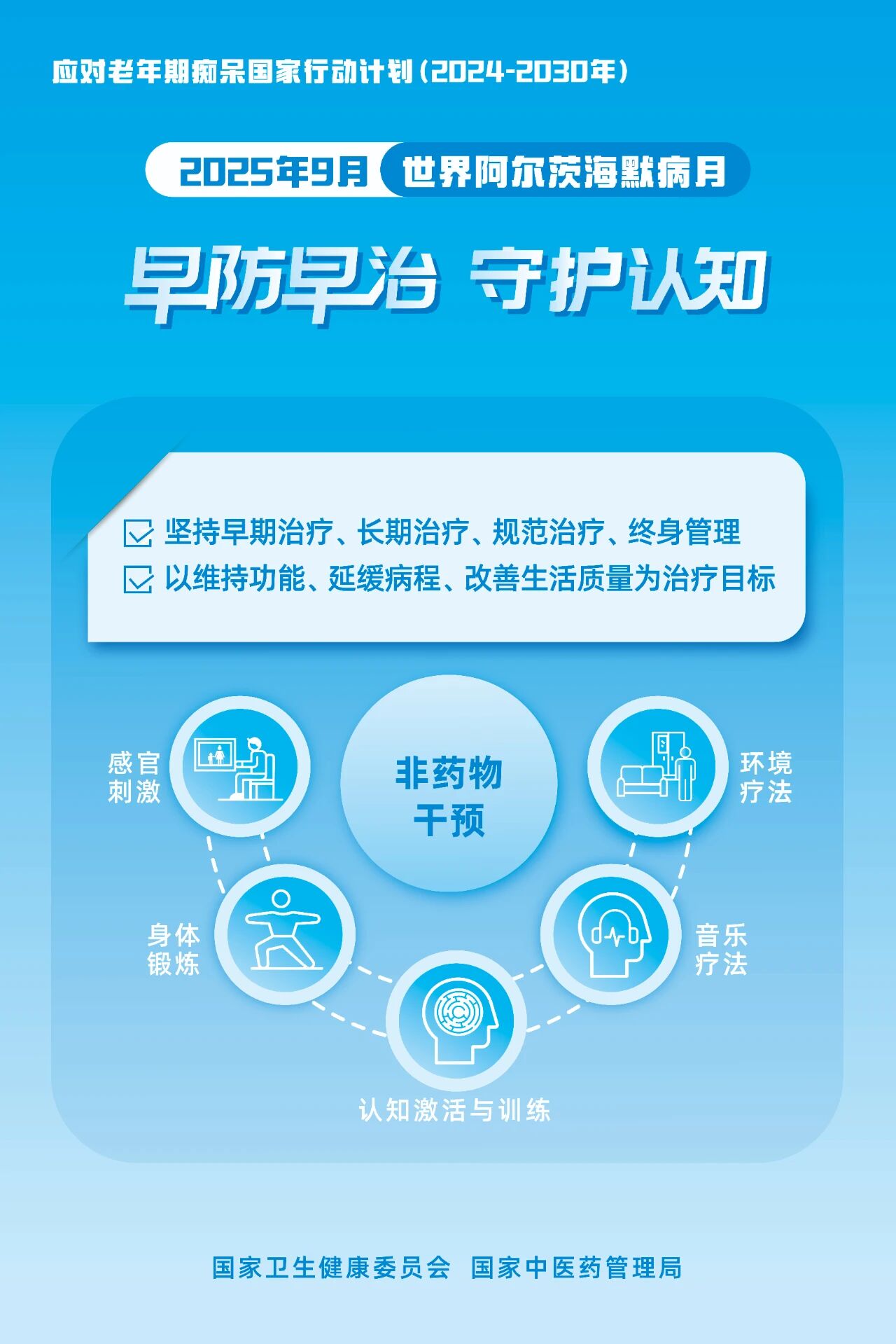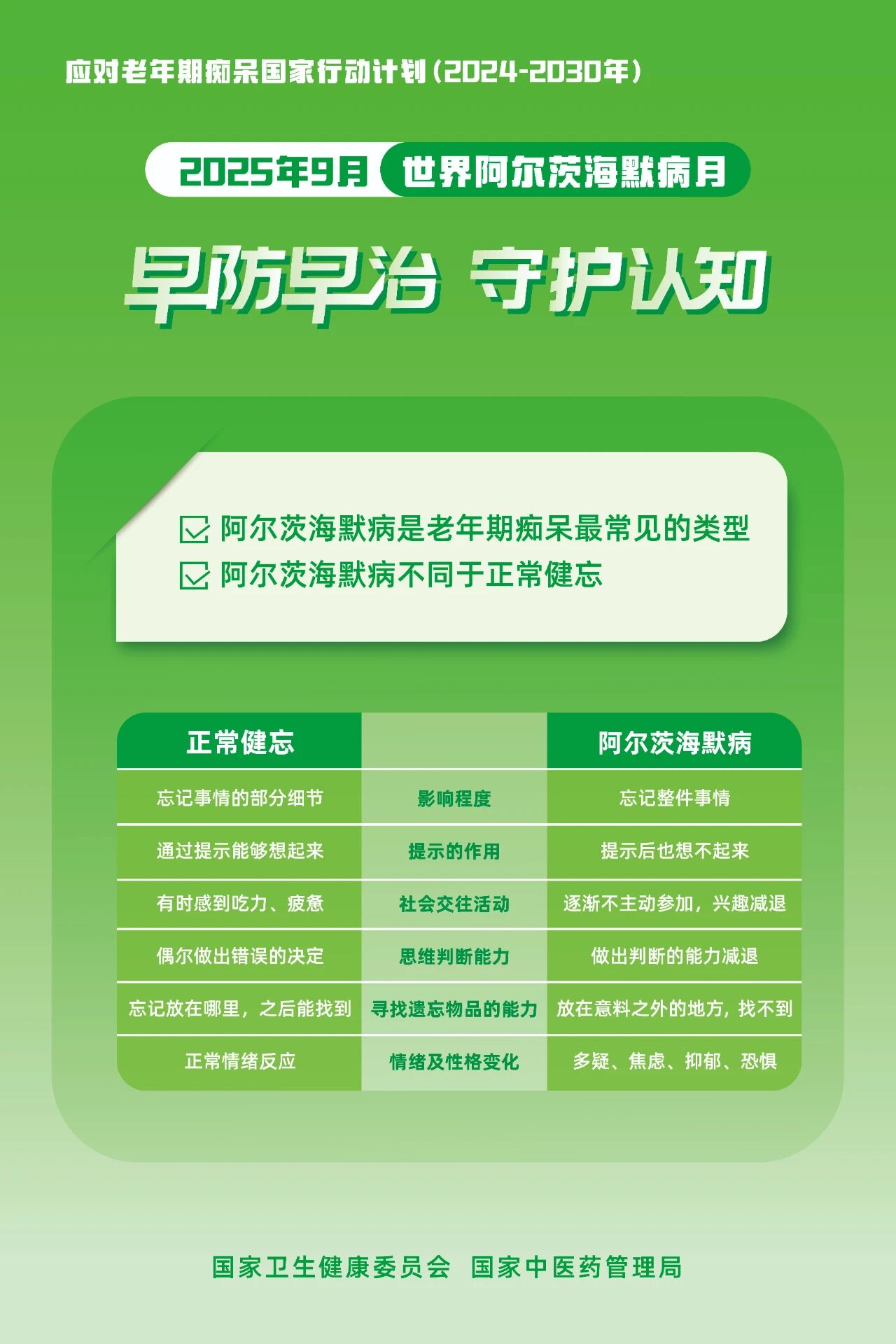 每年9月是“世界阿尔茨海默病月”,每年9月21日是“世界阿尔茨海默病日”。2025年9月21日“世界阿尔茨海默病日”的活动主题是“早防早治,守护认知”,旨在引导全社会共同参与,提高公众对老年期痴呆的科学认识,增强早发现、早诊断、早干预的意识,营造关心、关爱痴呆老年人的社会氛围。㉔
