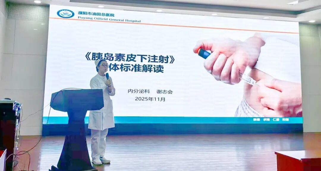 为增强糖尿病患者胰岛素规范注射意识,助力血糖平稳达标,2010年中华医学会糖尿病学分会将每年11月7日定为“糖尿病规范注射日”。为积极响应“规范胰岛素注射,提升糖尿病管理质量”的号召,切实推动临床注射护理标准化建设,濮阳油田总医院(以下简称“油田总医院”)糖尿病护理学组在组长刘淑婵的带领下,于11月6日成功开展以“针心守护,胰路平安”为主题的安全注射专项活动,为护理同仁搭建了学习交流、互促共进的专业平台。