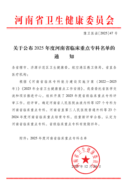 近日,河南省卫生健康委员会正式公布2025年度省临床重点专科名单,濮阳油田总医院(以下简称“油田总医院”)急诊医学科与消化内科凭借扎实的学科建设基础、规范的诊疗服务体系和持续的专业能力提升,双双成功入选。这一认定是省级主管部门对油田总医院专科建设水平的认可,这标志着该院在急危重症救治与消化系统疾病诊疗领域的规范化建设与服务能力达到省级重点专科标准。