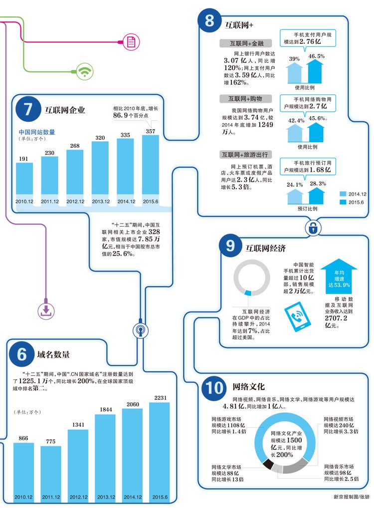 “十二五”期间,中国互联网蓬勃发展,初步建成快速便捷的网络环境,网络覆盖更广,宽带用户规模居全球首位。同时网络速度更快,网络基础资源更加丰富。