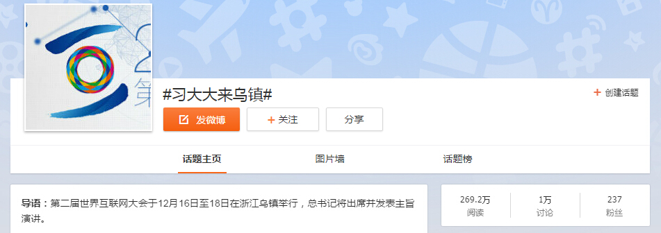 截至16日12时,由@浙江发布发起的微博话题#第二届世界互联网大会#累积获得6.6亿阅读量;由宁波网友@叙岚发起的微博话题#习大大来乌镇#阅读量已突破269万。