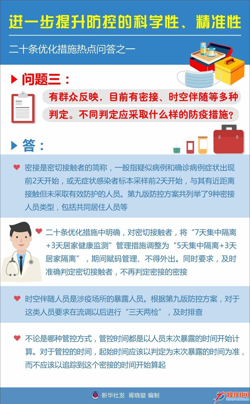 二十条优化措施中明确,对密切接触者,将“7天集中隔离+3天居家健康监测”管理措施调整为“5天集中隔离+3天居家隔离”,期间赋码管理、不得外出。同时要求,及时准确判定密切接触者,不再判定密接的密接。