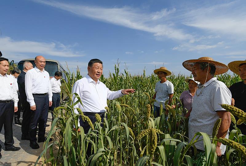 △2021年9月13日,习近平总书记在陕西米脂县高西沟村临时下车,察看粮食作物长势,同正在田间劳作的老乡拉家常。