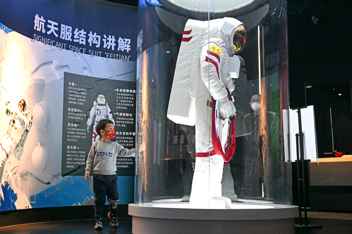 2023年1月7日,一名儿童在国家海洋博物馆参观“探索·星辰大海──航天科技主题成果巡回展”。新华社记者 赵子硕 摄