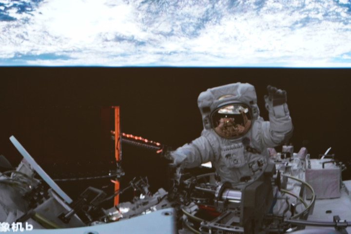 2023年4月15日在北京航天飞行控制中心拍摄的神舟十五号航天员张陆结束出舱任务返回问天实验舱时挥手致意的画面。新华社记者 郭中正 摄