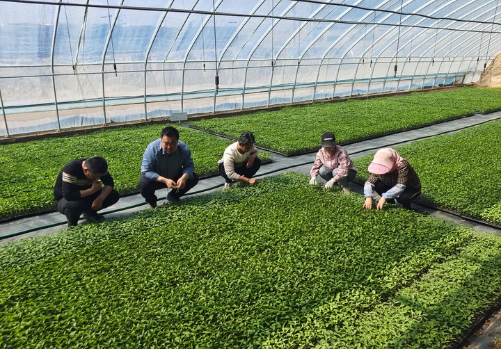 2023年4月30日,在甘肃省白银市靖远县东升镇,王定业(左二)与工作人员在大棚内一同检查种苗情况。新华社发