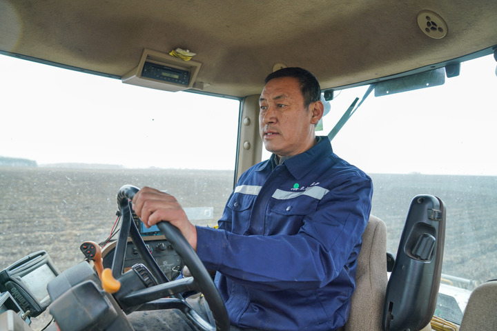 2023年4月12日,在黑龙江省北安市的北大荒集团建设农场有限公司一处农田中,许志国驾驶大型拖拉机进行分层定量施肥作业。新华社记者 王松 摄