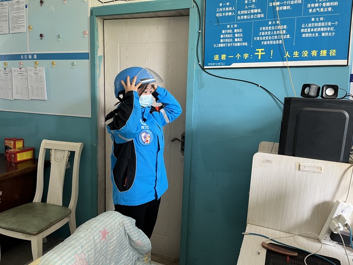 祖国大西北,宁夏银川。4月29日下午4点半,外卖女骑手丁国梅麻利地穿起工服、戴上口罩、戴好头盔,风风火火开始了晚高峰送餐。