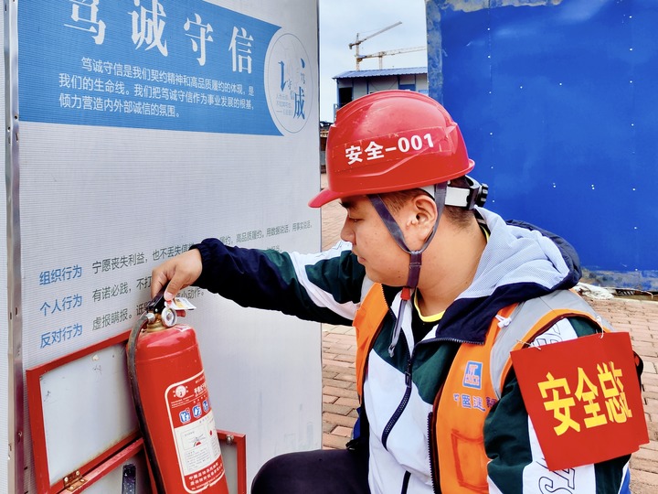 2023年4月30日,中建三局云南分公司安全总监蒲札在进行消防检查。新华社发(王威 摄)