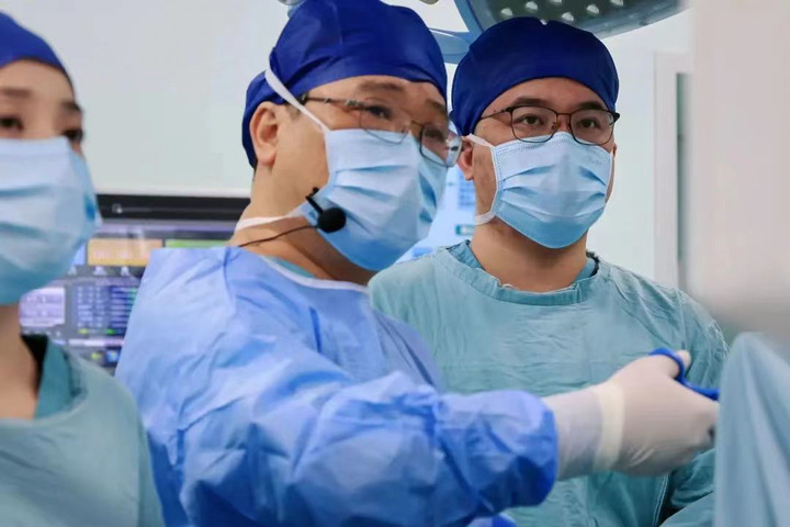 湖南省人民医院肝胆胰微创外科主任尹新民(中)在工作中(资料照片)。新华社发