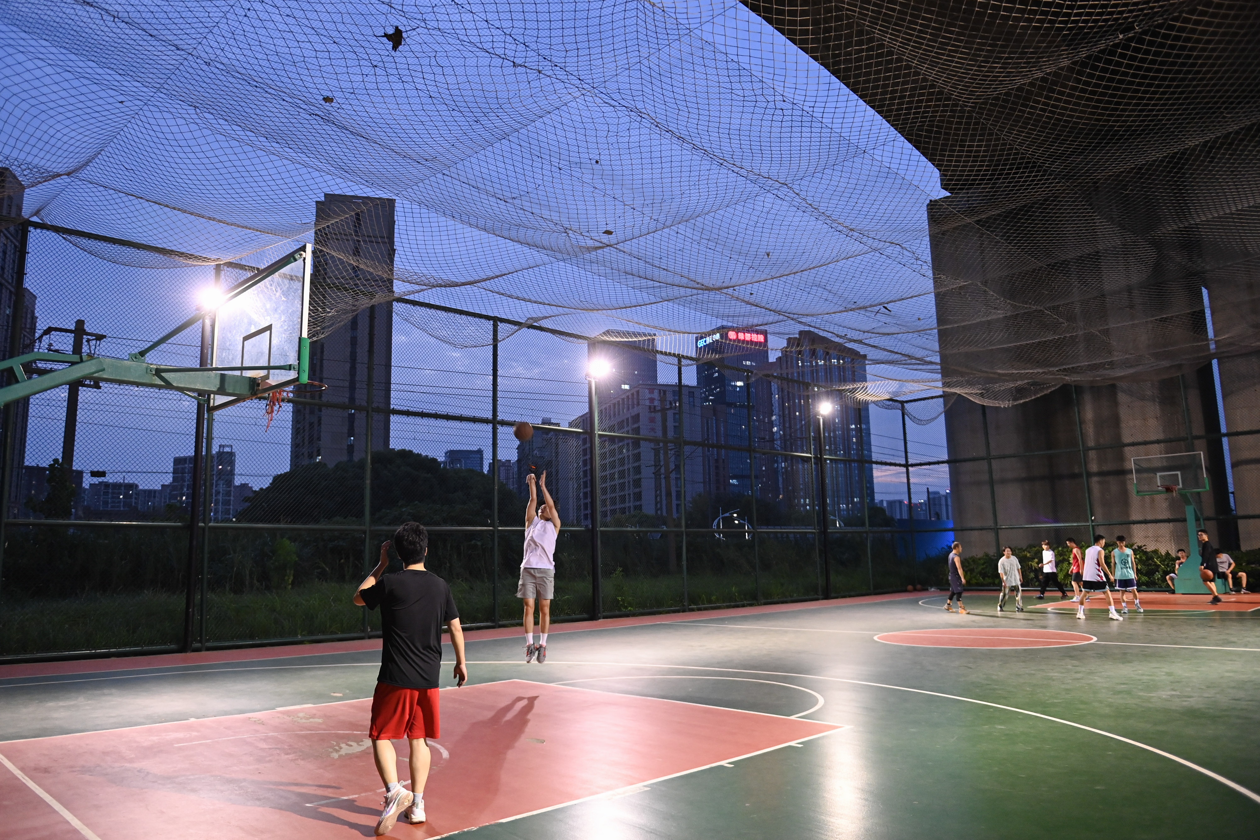 2022年9月20日,市民在位于高铁桥下的钱江世纪城体育公园打篮球。在杭州,一批运动场馆见缝插针地“嵌入”市民生活圈,城市空间的“边角余料”正成为全民健身的“金角银边”。新华社记者 黄宗治 摄