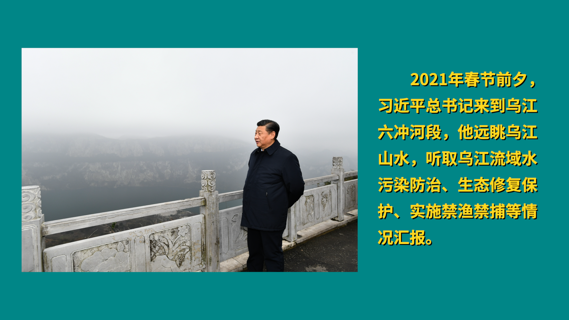 2021年春节前夕,习近平总书记来到乌江六冲河段,他远眺乌江山水,听取乌江流域水污染防治、生态修复保护、实施禁渔禁捕等情况汇报。在化屋码头,总书记沿江岸步行察看乌江生态环境和水质情况,对当地加强入河排污口管理和水质监测体系建设的做法表示肯定。
