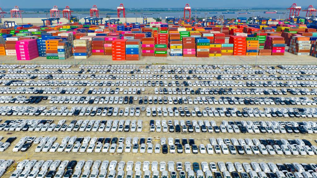 2025年10月4日在江苏省港口集团南京港龙潭港区拍摄的准备装船出口的汽车(无人机照片)。新华社发(杨素平摄)