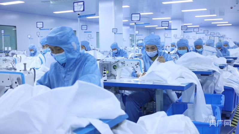医用正压防护服生产场景(央广网记者 夏莎 摄)