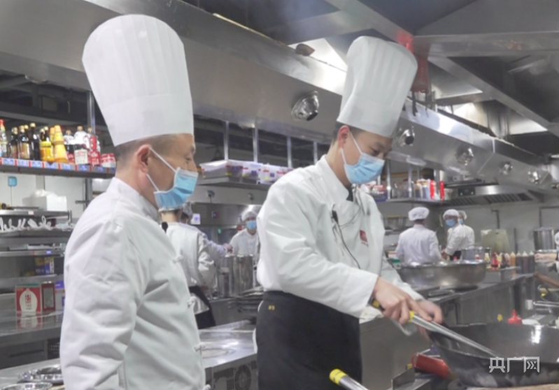 长垣市烹饪协会副会长冯建忠(左一)指导徒弟炒菜(央广网发 姬娴祎 摄)