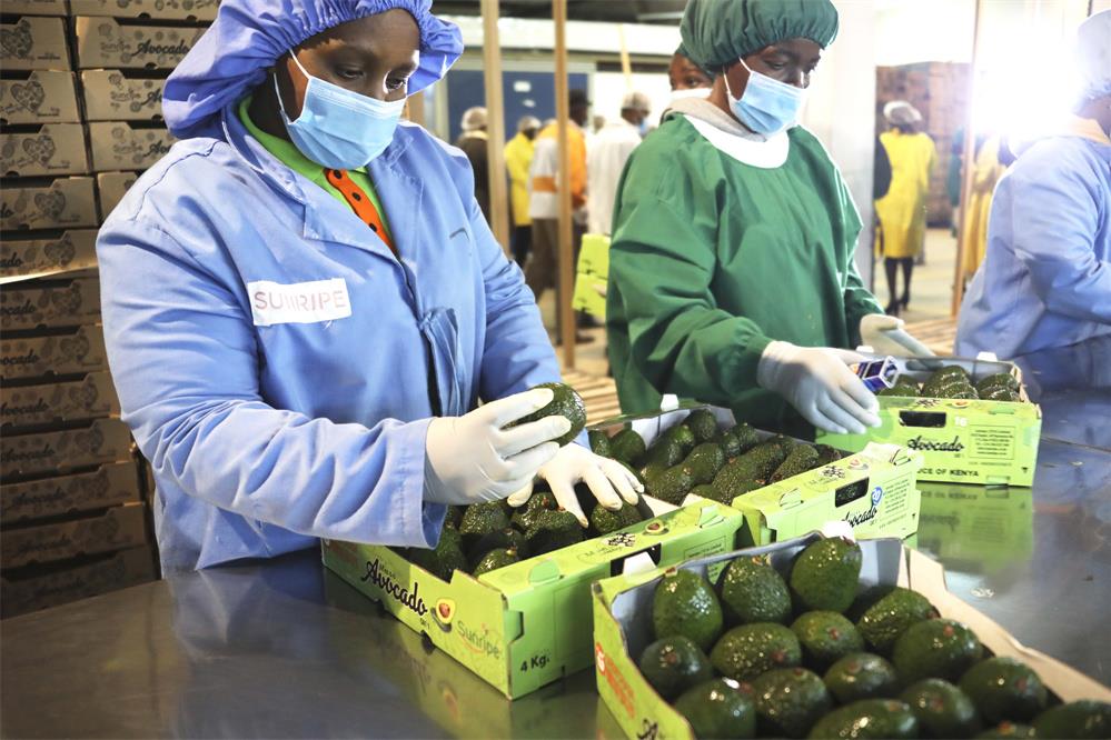 2022年8月2日,在位于肯尼亚利穆鲁镇的桑瑞普工厂,员工将牛油果装箱。桑瑞普工厂当日举行鲜食牛油果对华出口首发仪式,这是非洲鲜食牛油果首次出口中国。新华社记者 董江辉 摄