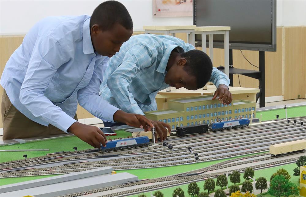 2022年9月19日,在位于吉布提首都吉布提市的吉布提工商学校,学生在鲁班工坊铁道运营沙盘教学区学习。新华社记者 董江辉 摄