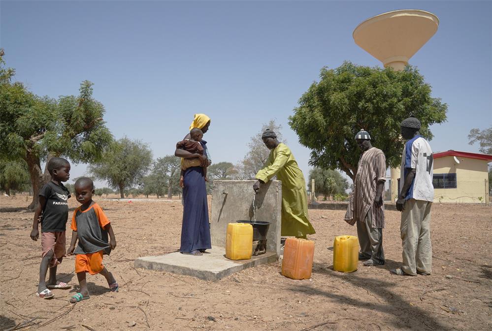 2023年3月20日,在塞内加尔久尔贝勒区的泰内富勒村,中地海外塞内加尔公司乡村打井工程水井协调员帮助村民取水。新华社记者 韩旭 摄