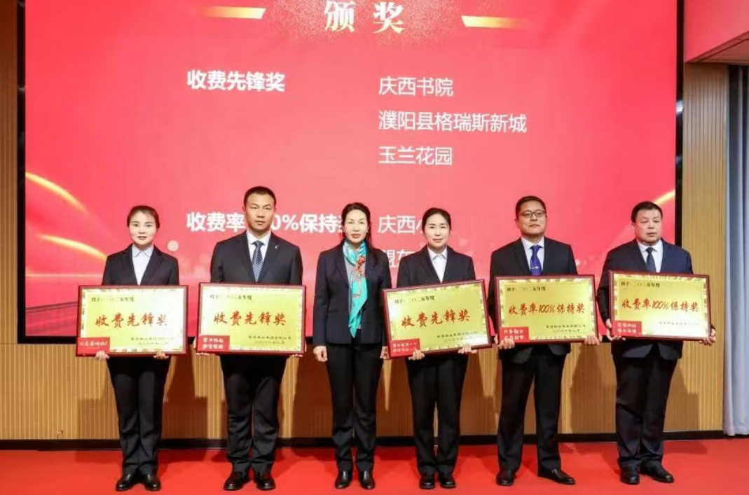 大会进入表彰环节,信原物业副总经理冯晓丽上台,宣读了《2025年度表彰决定》。张丽、郑广乾以及信原物业公司班子其他负责人分别为各批次获奖代表颁奖并合影留念。这份荣誉,既是对他们过去一年卓越成绩的肯定,更是对他们2026年接续奋斗、再创佳绩的殷切期许。