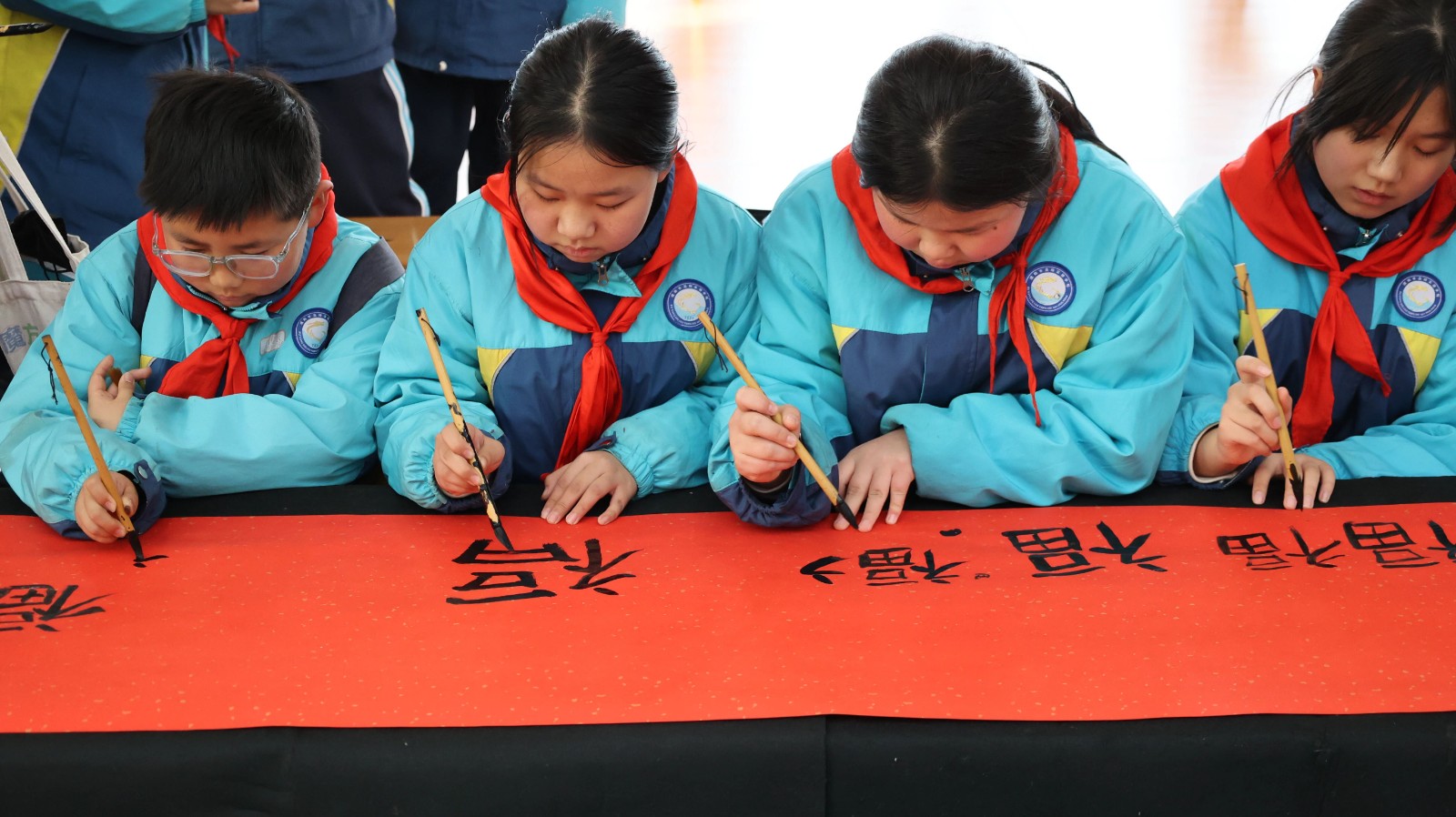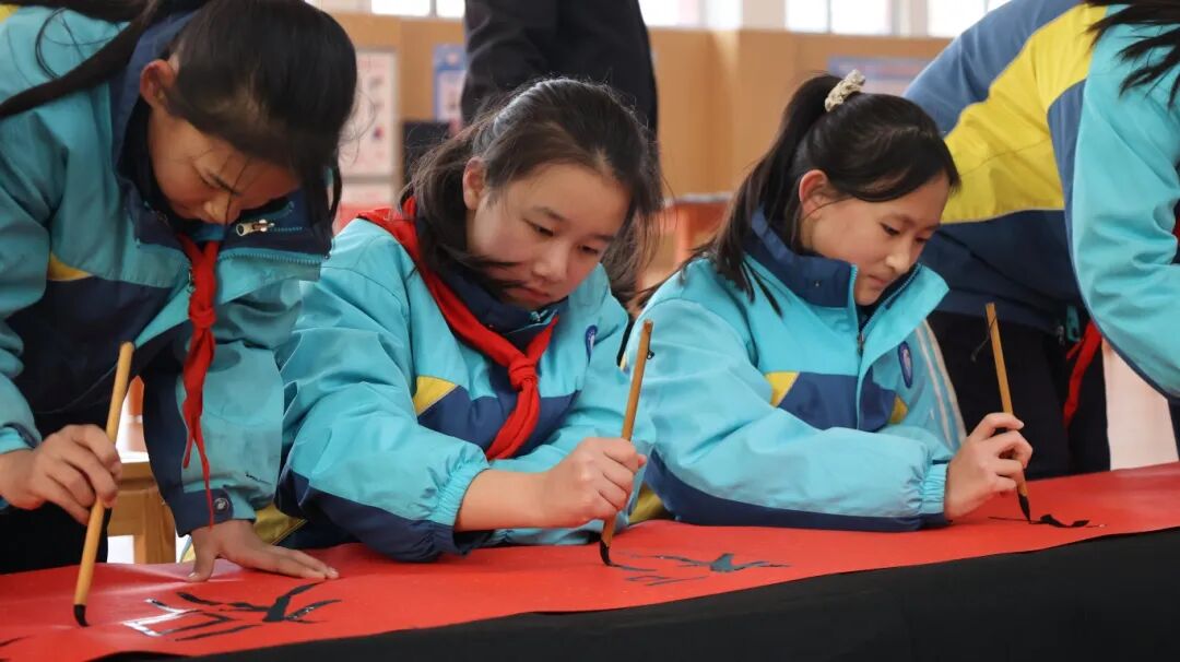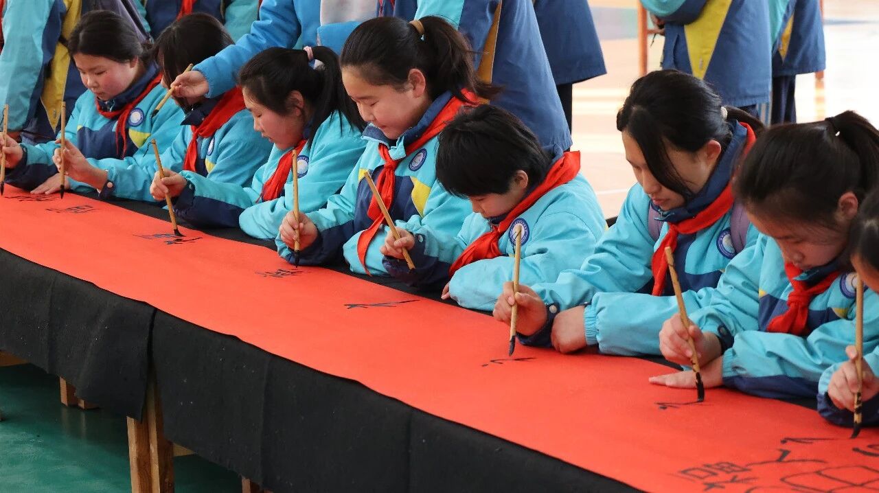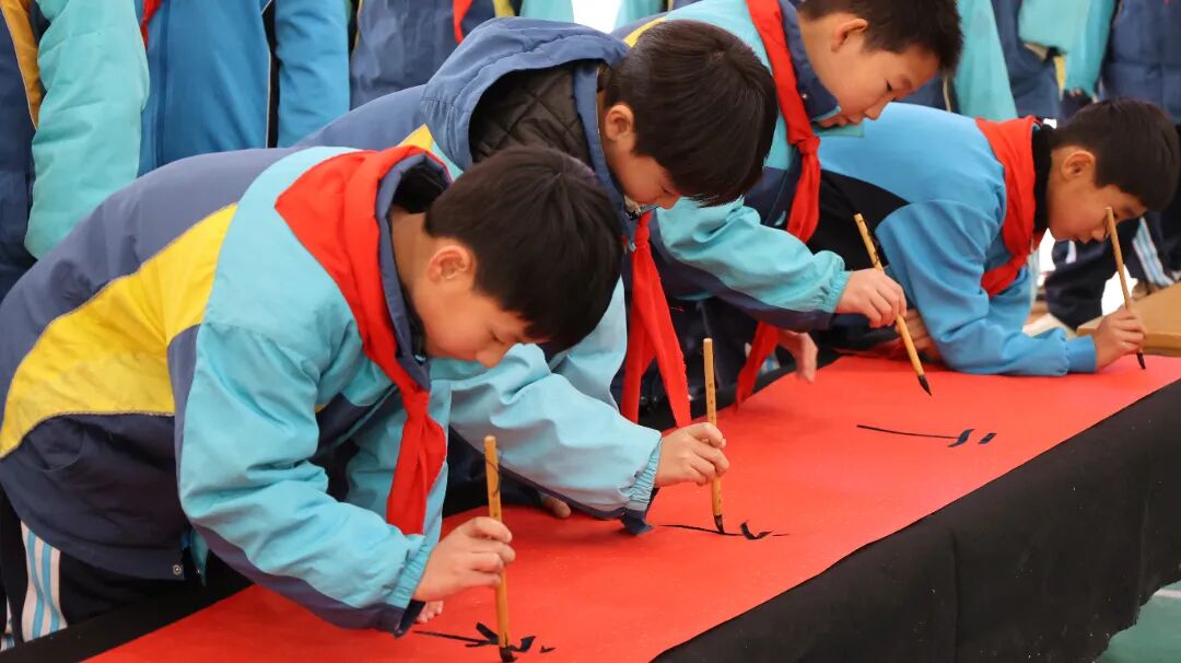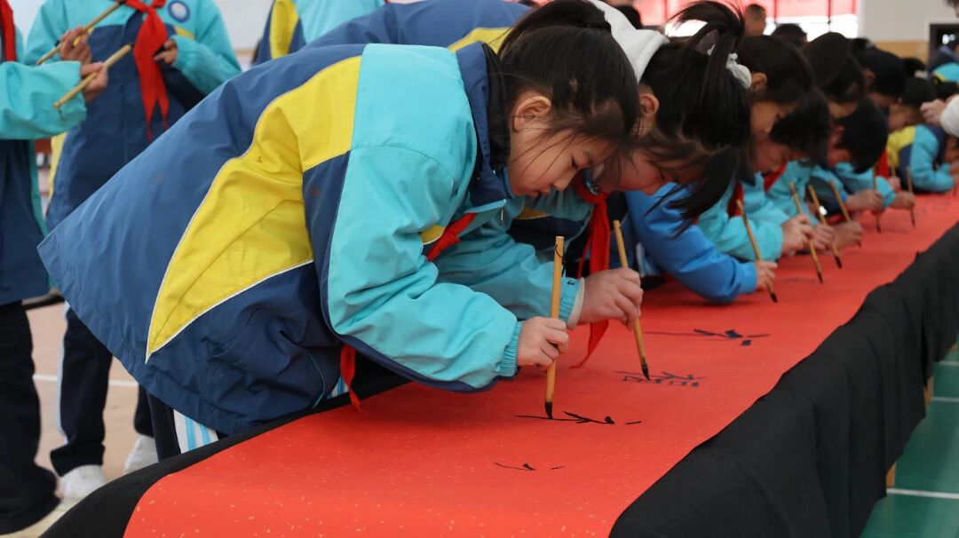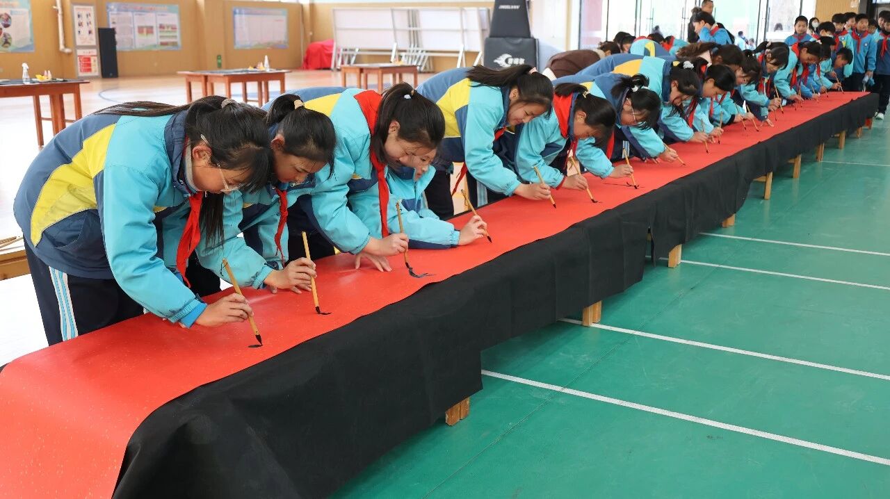 冬日暖阳洒满高阳校园,一卷百米素宣徐徐铺展,濮阳市高阳实验学校四、五年级的学子们齐聚一堂,以笔为媒、以墨传情,在横竖撇捺间书写新春福韵,在凝心聚力中共绘成长新篇。这场笔墨书福的盛会,让中华传统文化的韵味在校园流淌,也让新年的美好期许在笔尖悄然绽放。