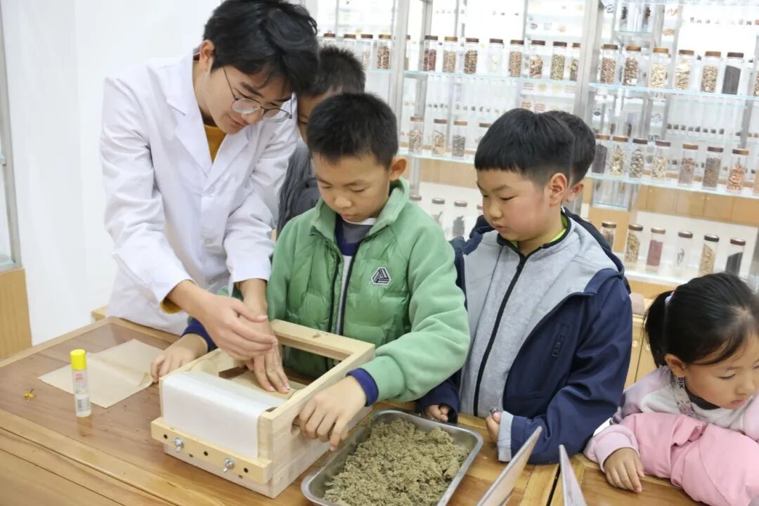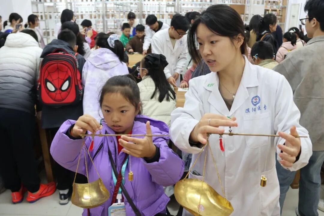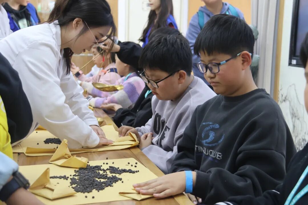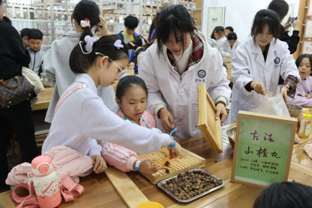 在中医药文化馆,历史的厚重感与现代的趣味性完美结合。药学院志愿者向小记者们讲述了一代代中医药人秉承“传承精华、守正创新”的重要理念,并亲手体验了“戥称”称药、卷制艾条、搓山楂丸,让中药学的传统技艺变得可触可感,小记者们在成就感中体会到了中医的严谨与智慧。