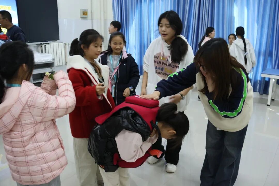 在急救教室内,校红十字会的老师为小记者们带来了一堂干货满满的“生命必修课”。志愿者们用情景模拟的方式,手把手教授“海姆立克急救法”的标准动作。小记者们在寓教于乐中,牢牢掌握了这项关键时刻能救命的技能,个个都像拥有了超能力的“小英雄”。