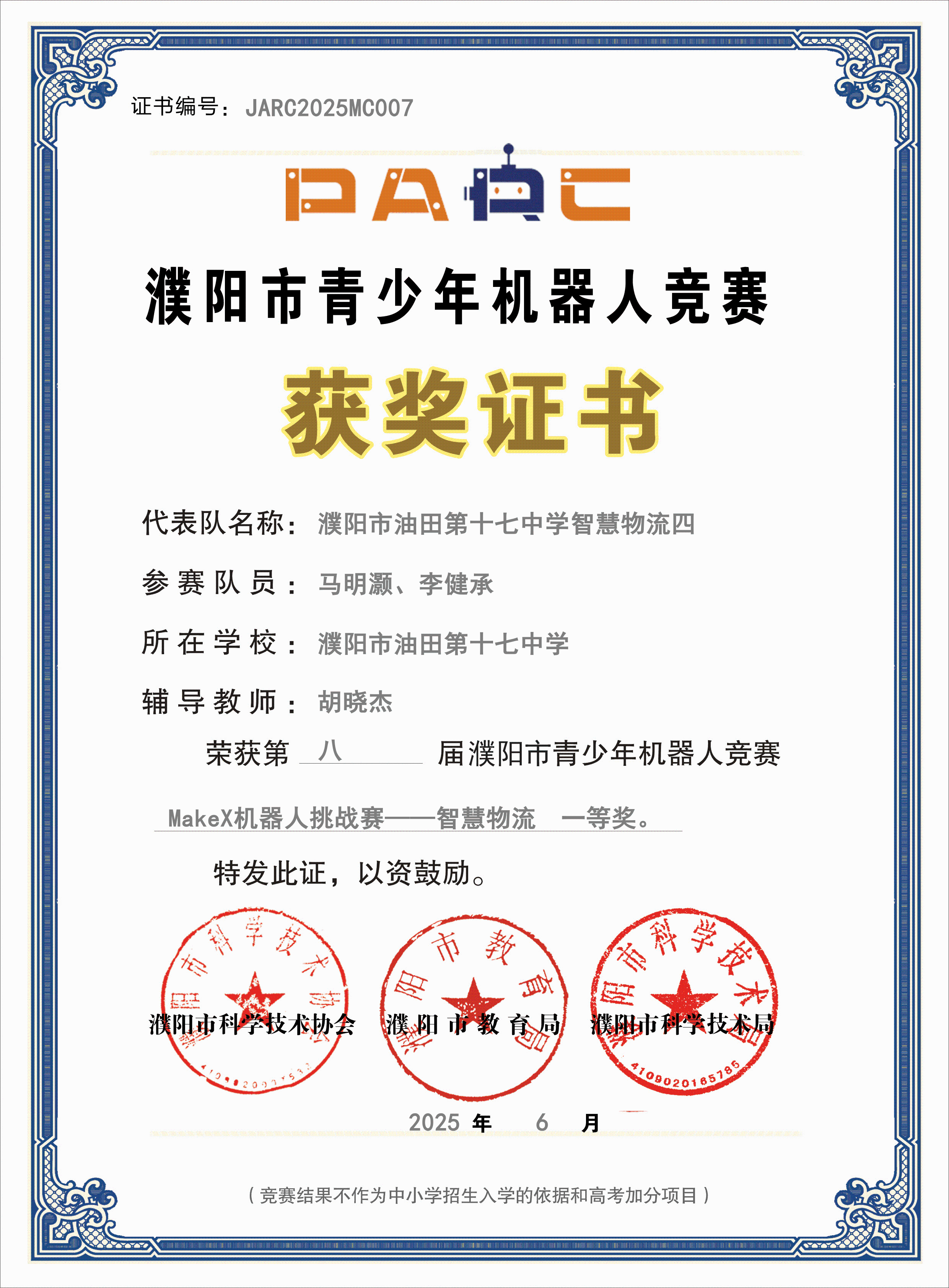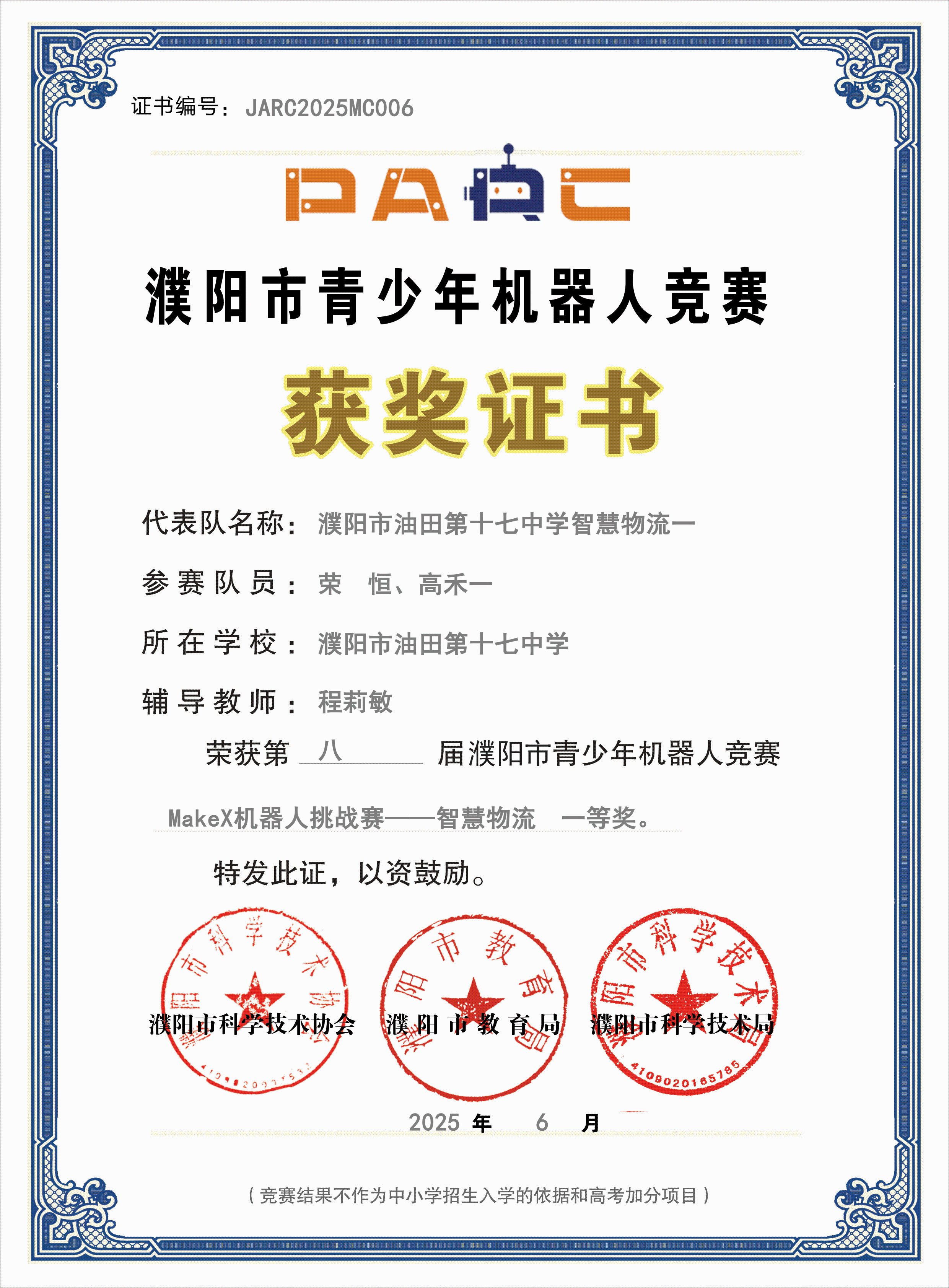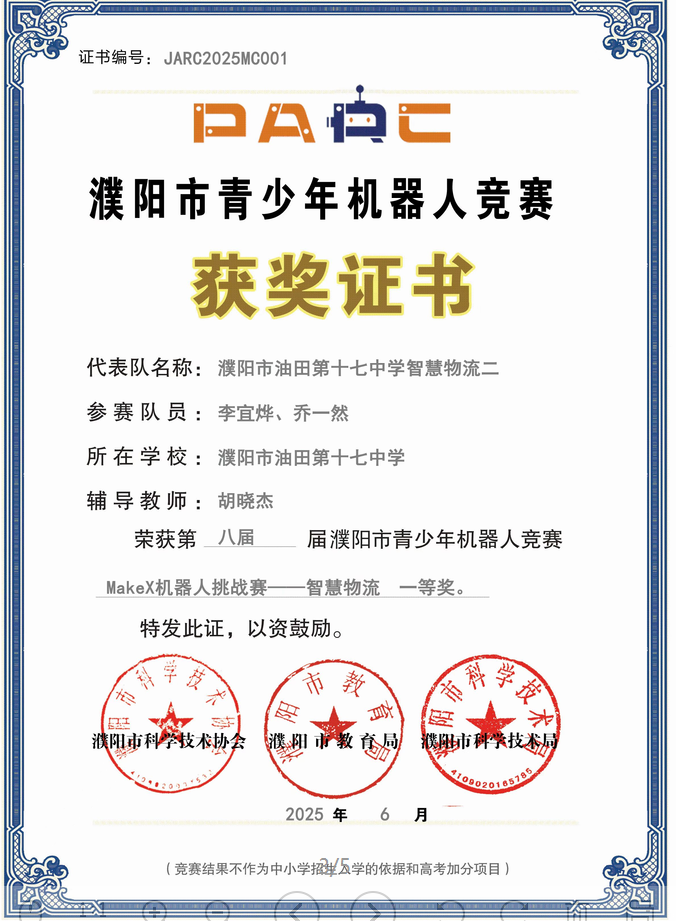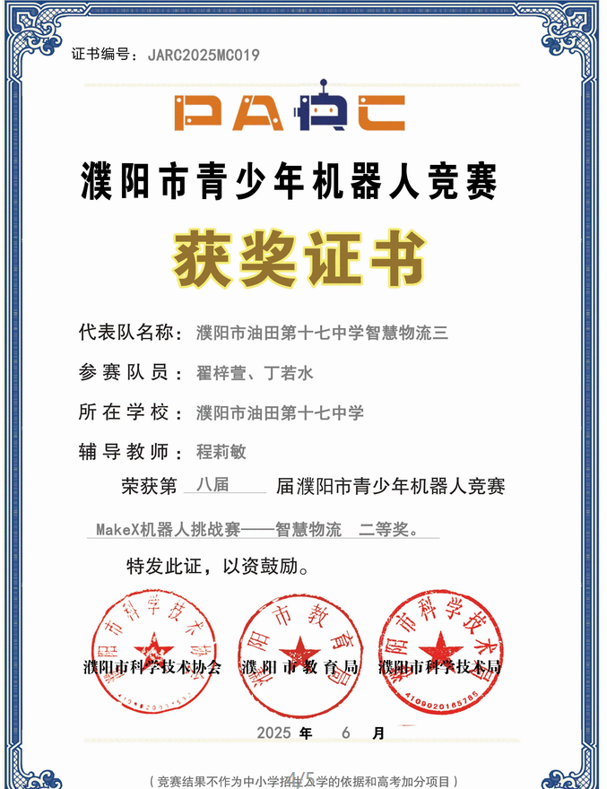 此次竞赛中,濮阳市油田第十七中学代表队凭借扎实技术、稳定临场发挥及默契团队配合,共获一等奖 3 项(荣恒 & 高禾一、马明灏 & 李健承、李宜烨 & 乔一然)、二等奖 1 项(翟梓萱 & 丁若水)、三等奖 1 项(张浩泽 & 王俊哲);程莉敏、胡晓杰老师获评 “优秀辅导教师”。