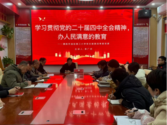 随后,李广忠书记以《学习贯彻党的二十届四中全会精神,办人民满意的教育》为题,为全体党员讲授第四季度专题党课。党课开篇,李书记系统介绍党的二十届四中全会基本概况,从全会审议通过的《中共中央关于制定国民经济和社会发展第十五个五年规划的建议》中,提炼梳理与教育事业紧密相关的重要论述。他着重强调,全会立足中华民族伟大复兴战略全局和世界百年未有之大变局,科学研判发展大势、系统擘画未来蓝图,将“一体推进教育强国、科技强国、人才强国建设”作为重大战略部署,把教育摆在前所未有的核心位置,为新时代教育工作者注入了强大信心、指明了前进方向、赋予了光荣使命。李书记号召全体党员教师充分发挥先锋模范作用,将学习贯彻全会精神与教育教学工作深度融合,推动党建与业务同频共振,以饱满热情和务实作风,为华龙区教育高质量发展添砖加瓦,为书写中华民族伟大复兴的教育篇章增光添彩。