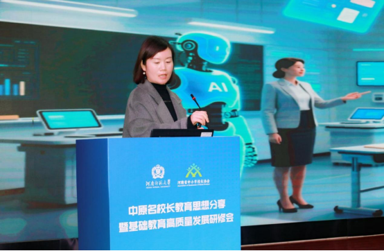 开幕式后,四位名校长分享前沿教育理念与实践思路。濮阳市实验中学党委书记王广英以《做有根的教育,育有魂的新人》为主题,阐述学校教育改革成果,提出“当校长——办学校——做教育”递进式理念及“育分——育人——育心”根魂理念。他深耕教育实践,以“有根育人、有魂铸魂”为核心,将理念贯穿办学全程,从归本弘道、培根铸魂、止于至善三方面分享实践路径:融合传统文化与AI技术重构课程,以课堂、校园、社会多维场景深化德育,搭配名师引领与多元评价体系,既破解“唯分数论”困境,又让学生在文化浸润与创新实践中成长。同时提及“根魂育人”品牌成效及未来深化“AI+教育”、加强校际合作的规划。