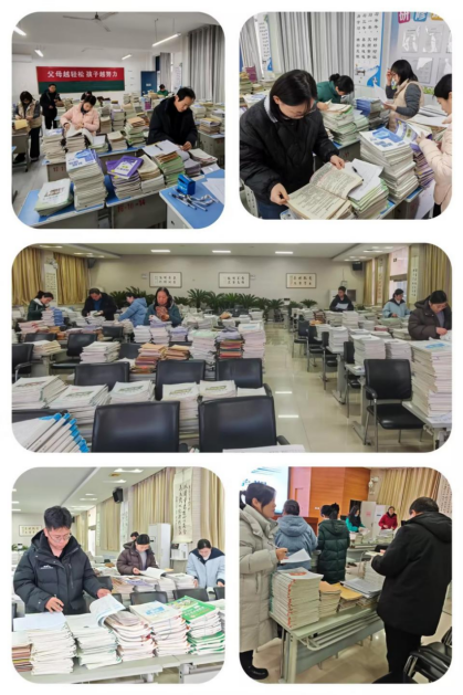 1月7日,濮阳市实验中学实中大讲堂里摆满了各班的学生作业本。这是学校2025-2026学年第一学期第二次教学常规检查的现场,一场对教学过程的“例行体检”正在有序展开。