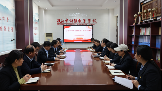1 月 13日,濮阳市特殊教育学校召开专题会议,深入学习领会 2026 年全国教育工作会议精神。学校党支部书记、校长吴守刚主持会议,全体校领导及中层干部参加会议,围绕会议精神展开深入学习和交流研讨,共同凝聚育人共识、谋划发展蓝图。