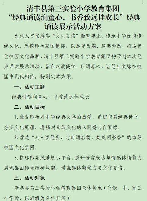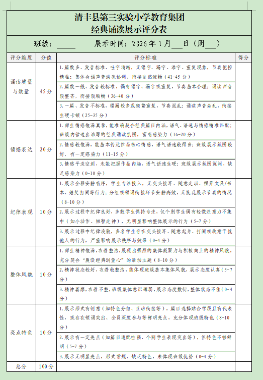 为传承中华优秀传统文化,厚植家国情怀,打造特色校园文化,2026年1月5日至14日,清丰县第三实验小学教育集团开展了“经典诵读润童心 书香雅韵伴成长”经典诵读展示活动。活动以“真实参与铸魂、扎实筹备固本、朴实呈现立根”的实践姿态践行“三实精神”,秉持“和而不同,美美与共”的育人理念,让各学段、各班级在经典传承中彰显特色风采,让书香雅韵浸润校园每个角落,为校园文化建设注入深厚的传统文化力量。