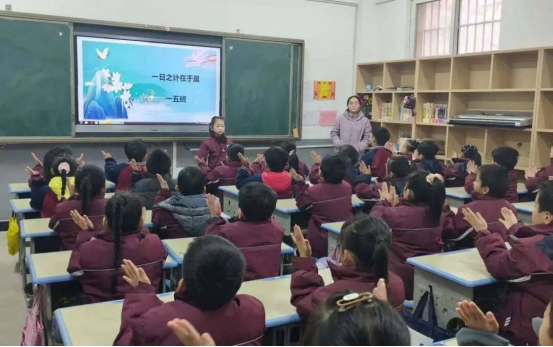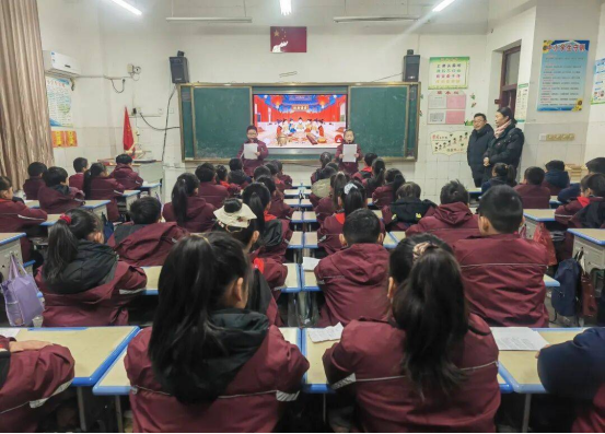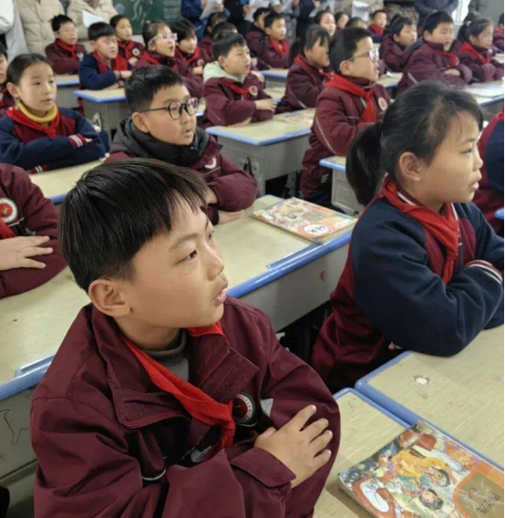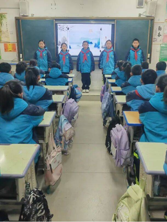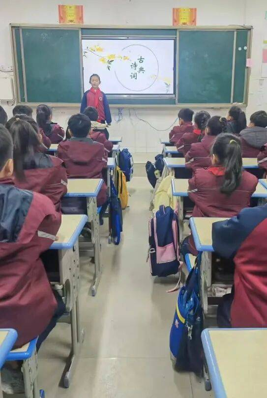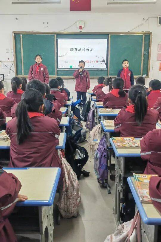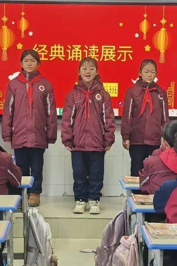 1月7日至9日,三至五年级学子接力登场。三年级以“领诵+合诵”的形式演绎经典古诗文,队形整齐有序,诵读错落有致;四年级融入情境元素,在诵读中辅以简单肢体动作,让经典内容更具画面感;五年级学子则品读《论语》节选等国学名篇,情感饱满、意蕴悠长,将经典的文化魅力与当代少年的精神风貌完美融合。