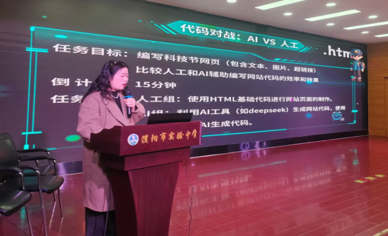 崔丹丹老师则带来《科技节网页拯救行动》信息技术课。学生通过修复网页、体验AI编程,在“人机协作”中锻炼逻辑思维与创新能力。该课程充分体现“AI赋能教育”的实践路径,呼应了科技强国战略下对学生信息素养的培养要求。课程以“人机协作”为载体,注重创新素养与团队协作精神的培育,引导学生在技术实践中树立科技报国的志向,体现了信息技术学科在“AI赋能教育”背景下的独特育人价值。