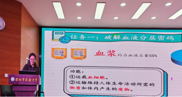 朱林玉老师则围绕《流动的组织——血液》展开生物学科智慧教学。她利用虚拟仿真实验平台,构建血液分层、血细胞功能的动态三维模型,学生可通过交互操作直观观察血液组成与物质运输机制。课堂融入健康大数据分析,引导学生结合AI健康助手解读血常规报告,在科学探究中渗透“健康中国”理念。课堂引入无偿献血公益知识,弘扬爱心奉献、守护生命的社会风尚;通过对血液功能与重要性的深入学习,引导学生树立珍视健康、尊重生命的科学观念,生动体现了党建与学科育人在数字化教学中的深度融合。
