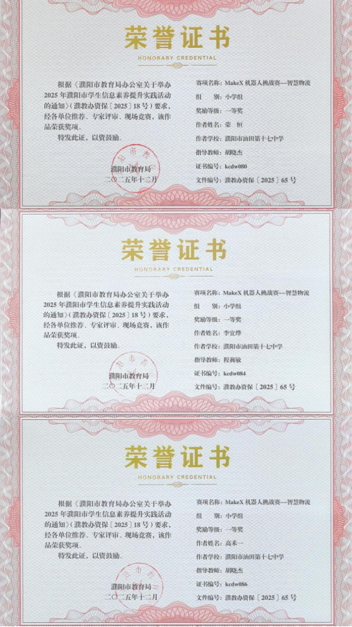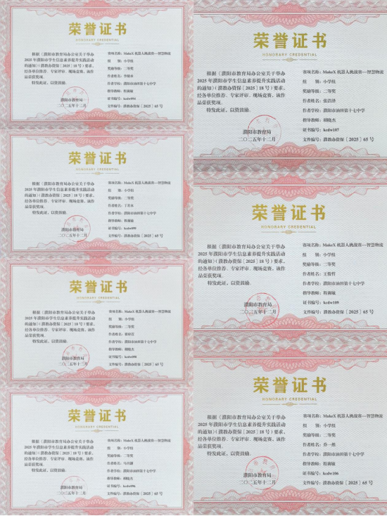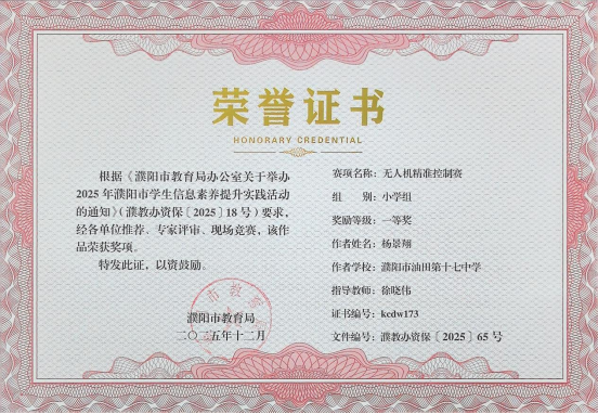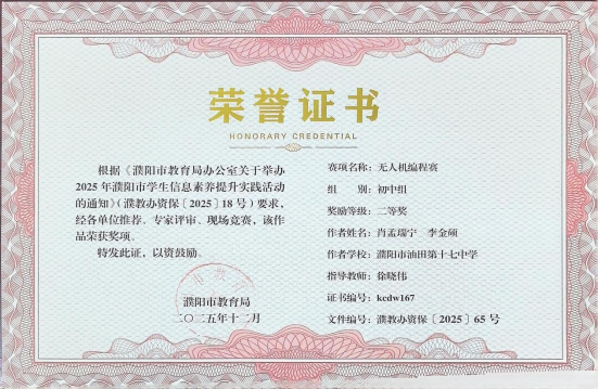 在无人机相关赛事中,我校学子同样表现亮眼,用精准操控与创新编程诠释了科技少年的风采,无人机精准控制赛中,杨景翔同学凭借稳定的操作手感、精准的空间判断,在众多参赛者中脱颖而出,勇夺一等奖。无人机编程赛中,肖孟瑞宁、李金硕两名同学以清晰的编程思路、高效的代码设计,完美完成指定任务,斩获二等奖!