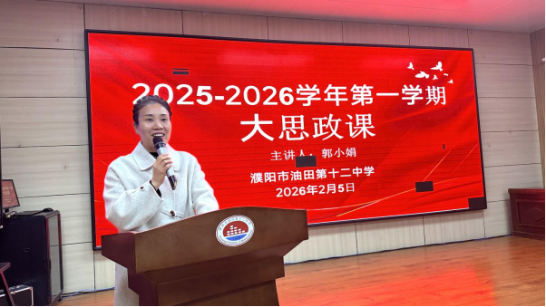 2026年2月5日上午,濮阳市油田第十二中学顺利召开2025 - 2026学年第一学期放假大会,华龙区教育局党组副书记、副局长郭小娟,国学传统文化高级讲师、学生立志文推广志愿者郭瑞红,濮阳市油田第十二中学党总支副书记、校长张海高携学校领导班子及全体教师参加了本次大会。会议由张爱凤副校长主持。