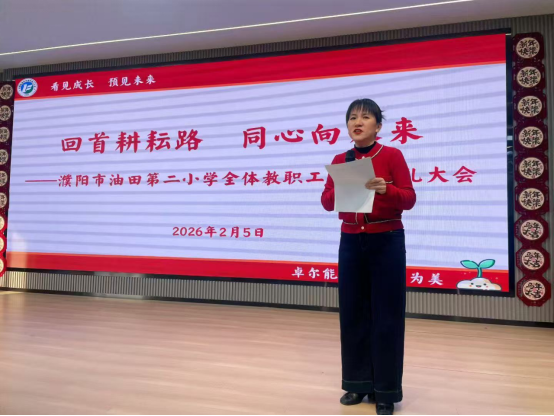 春临岁末,岁聿云暮;初心如磐,聚力前行。2026年2月5日,濮阳市油田第二小学教育集团全体教职工齐聚一堂,以一场主题鲜明、温情满溢的放假典礼,为本学期教育教学工作画上圆满句号。大会紧扣“回首耕耘路,同心向未来”核心主题,将党建引领贯穿始终,通过表彰先进、分享温情、部署工作,凝聚起全体教职工踔厉奋发、勇毅前行的磅礴力量,为新学期高质量发展筑牢坚实根基。大会由王春晓副校长主持。