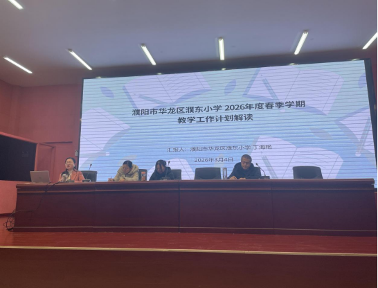 春回校园万象新,奋楫扬帆正当时。为落实华龙区教育局2026年工作部署,明确新学期教学重点,落实立德树人根本任务,推动教育教学高质量发展,2026年3月4日上午,濮阳市华龙区濮东小学2026年春季学期教学工作部署会在学校报告厅召开。教学副校长丁海艳作专题工作部署,全体教师齐聚一堂、凝心聚力,共绘新学期教学发展蓝图。