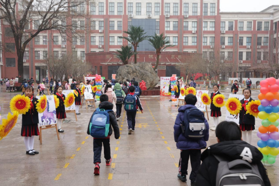 学校领导班子及中层干部早早来到校园,站在校门口两侧微笑迎接每一位返校的学子。校门口,拱形门上的“我们开学了”五个大字格外醒目,让入学通道洋溢着浓浓的仪式感,气球立柱点缀其间,十幅关于“马”的绘画作品整齐排列,寓意“龙马精神”。笛子、古筝、葫芦丝的悠扬乐声回荡在校园上空,欢乐的旋律传递着新学期的祝福与希望。同学们身着干净整齐的校服,脸上洋溢着灿烂的笑容,走进美丽的校园。