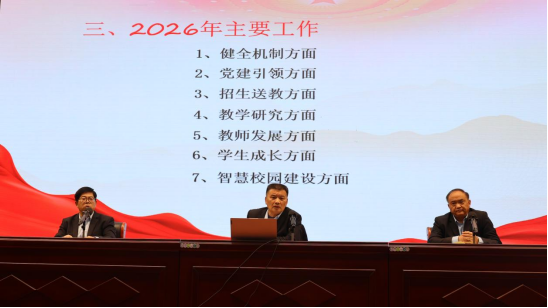 围绕2026年核心工作,吴校长从健全机制、党建引领、招生送教、教学研究、教师发展、学生成长、智慧校园建设、改善办学条件八大方面,作出全面部署与细致安排。从集团化办学机构成立、十五年一贯制办学模式建设,到扩大送教上门规模、开设培智部职教班;从冲刺国家级教学成果奖、重启教师三年培训工程,到推进智慧校园建设、升级校园硬件设施,每一项工作都紧扣“普惠发展、内涵提升”的特教发展要求,兼顾常规落实与重点突破,为学校新一年发展绘就清晰蓝图。同时强调“三个坚持”工作要求,坚持每月常态化工作秩序巡查、每月的安全工作例会和每月一次的学生管理工作会,筑牢学校发展的基础保障。