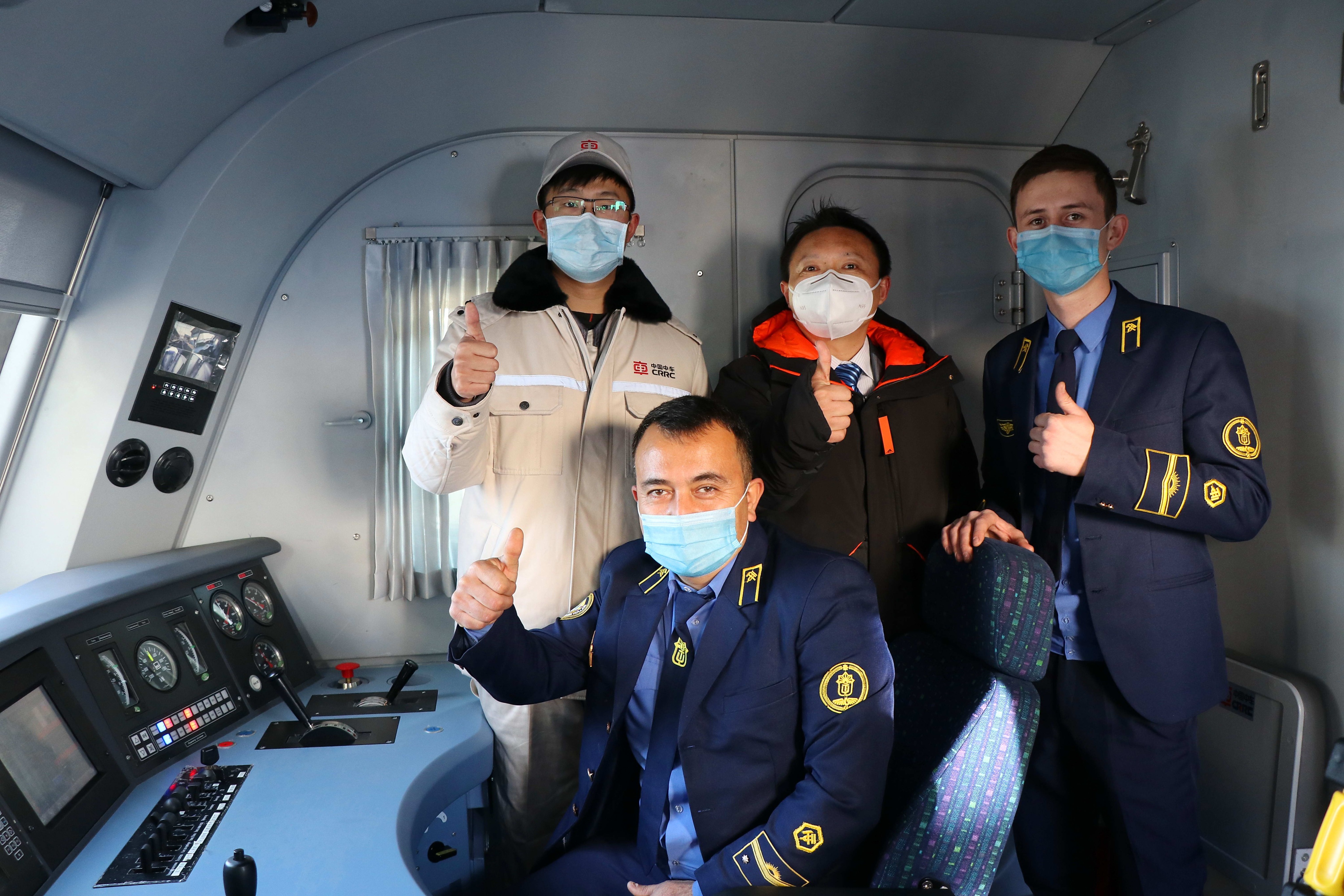 这是中国电力机车出口乌兹别克斯坦,中方技术人员和乌方驾驶人员的合影。