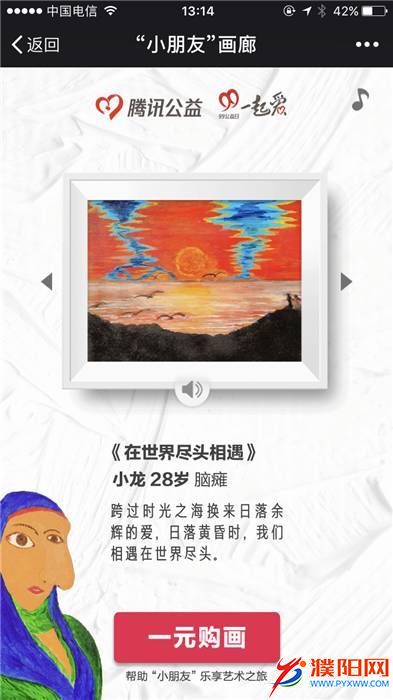 从页面信息来看,“小朋友画廊”中提供了36幅画作,这些画作的作者均为自闭症患者、脑瘫患者、精神障碍患者、智力障碍患者。每个作品下方附有作者的名字、年龄以及作品简介。